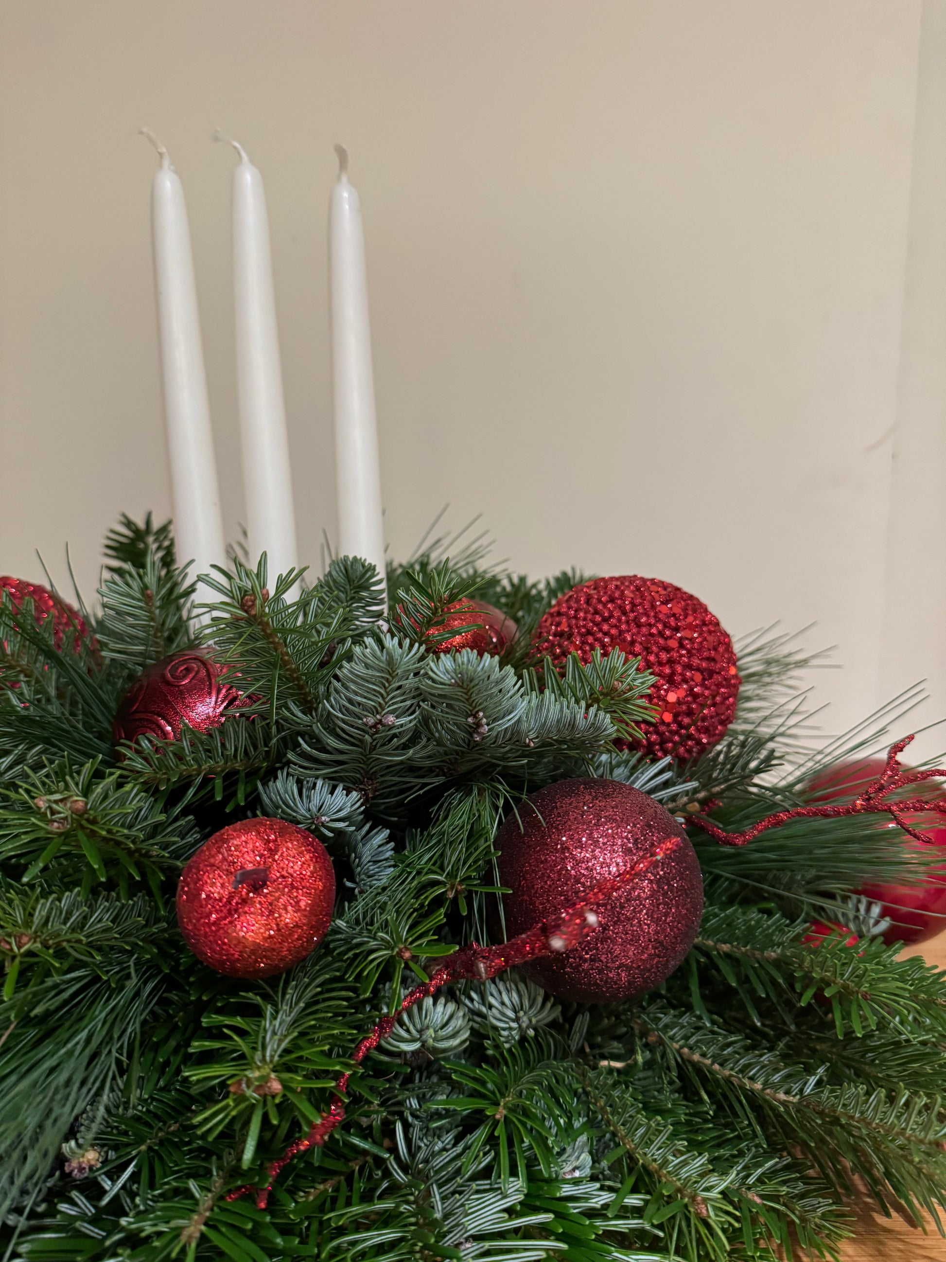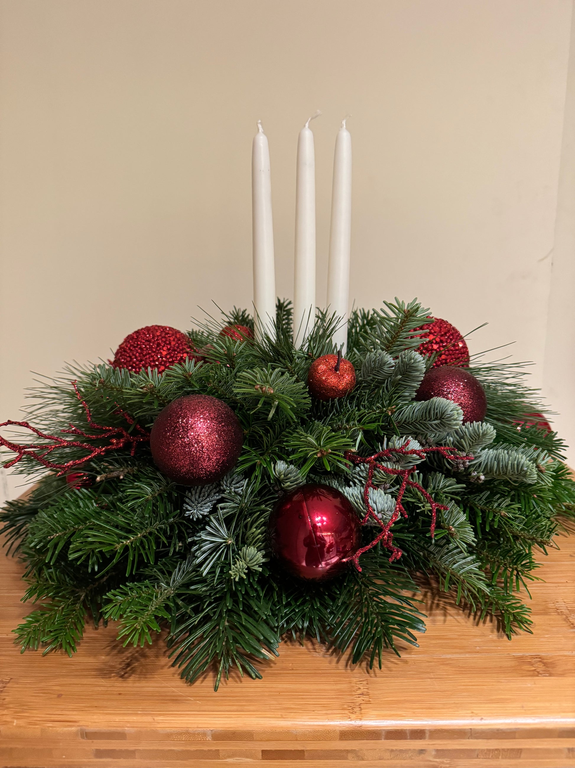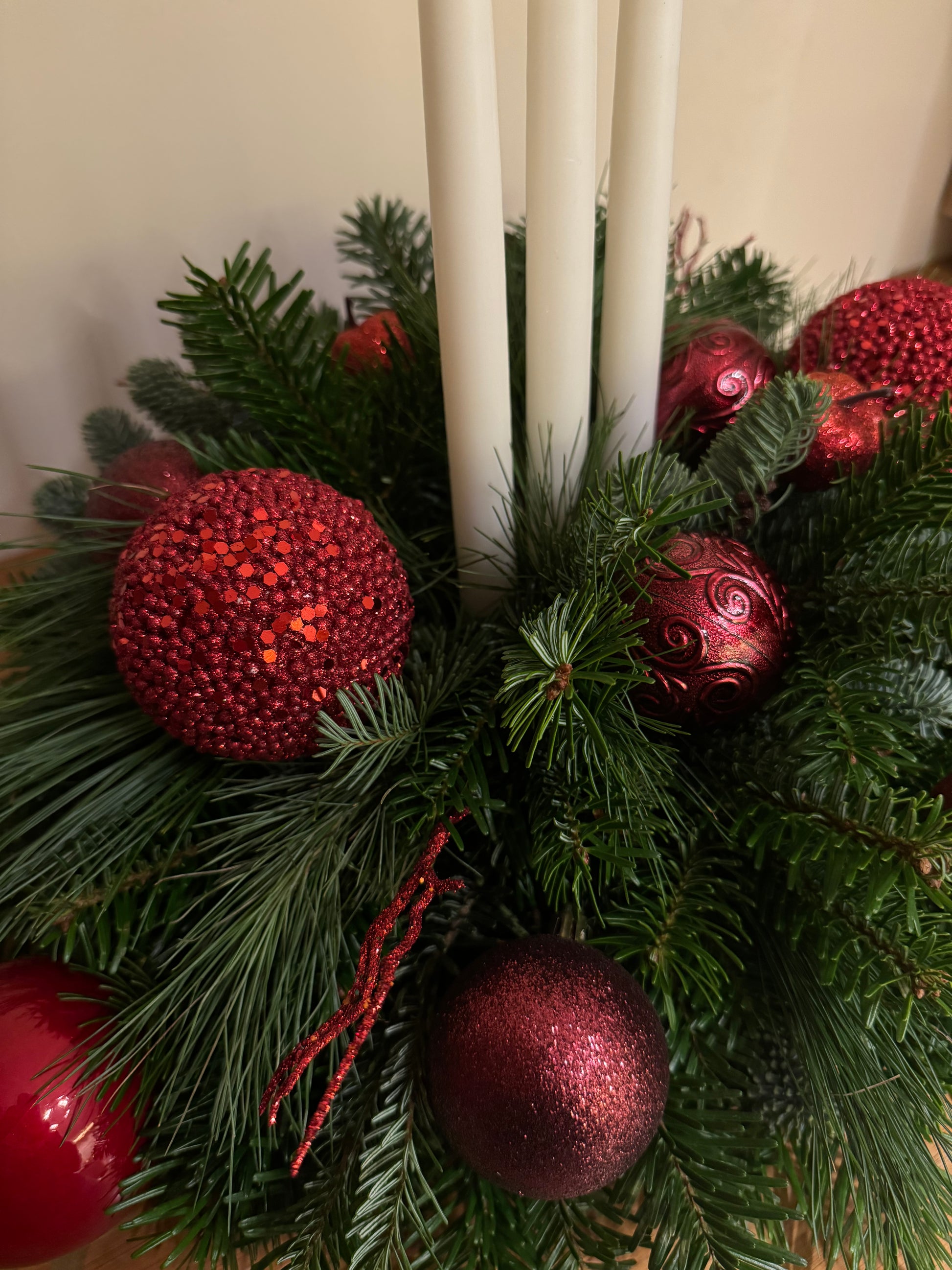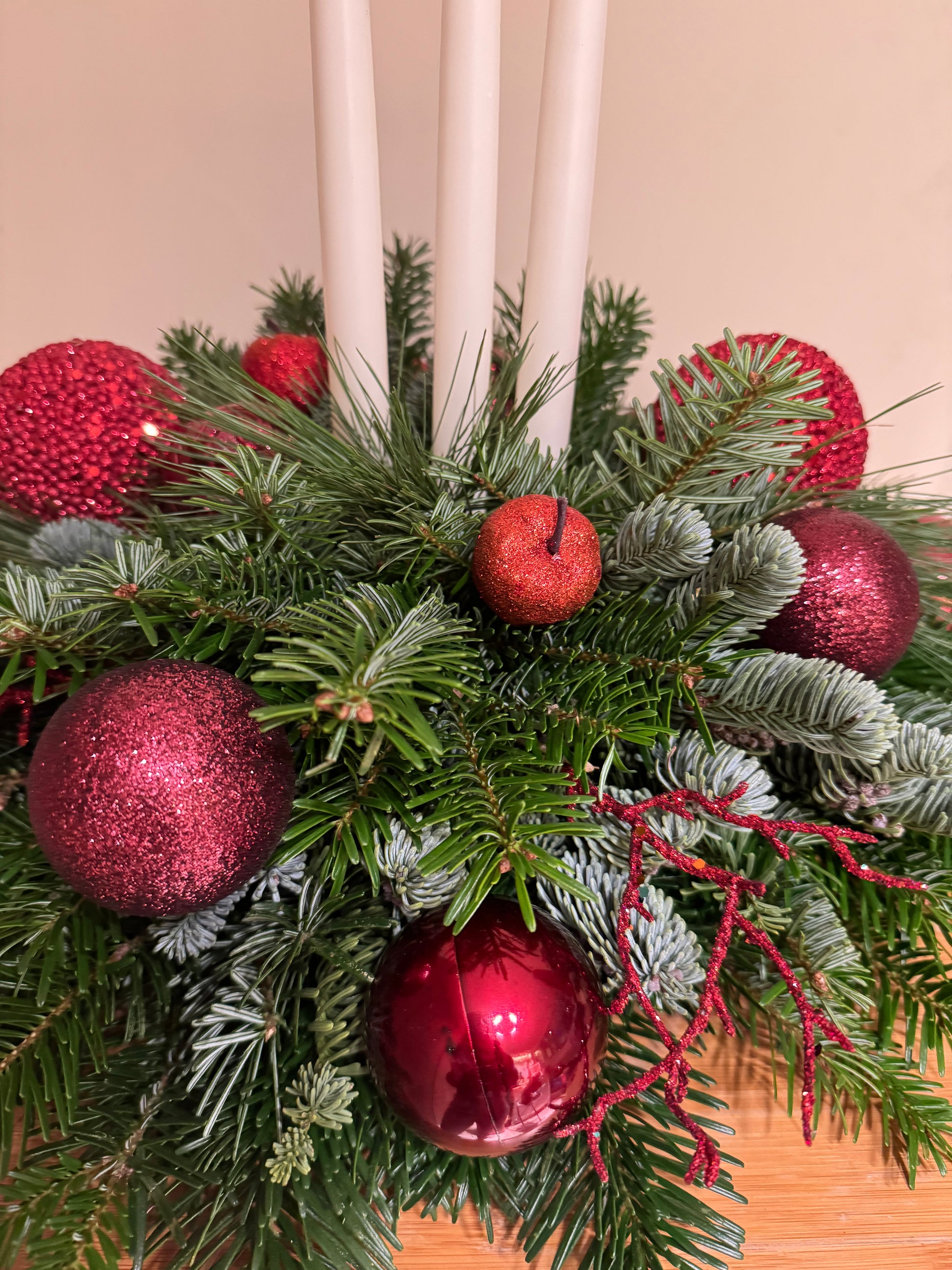 A breathtaking red holiday centerpiece adorned with exquisite red baubles, sparkling ornaments, and an air of sophistication. Ideal for both a lengthy 5-meter table or an intimate round setting, it's perfect for any occasion.