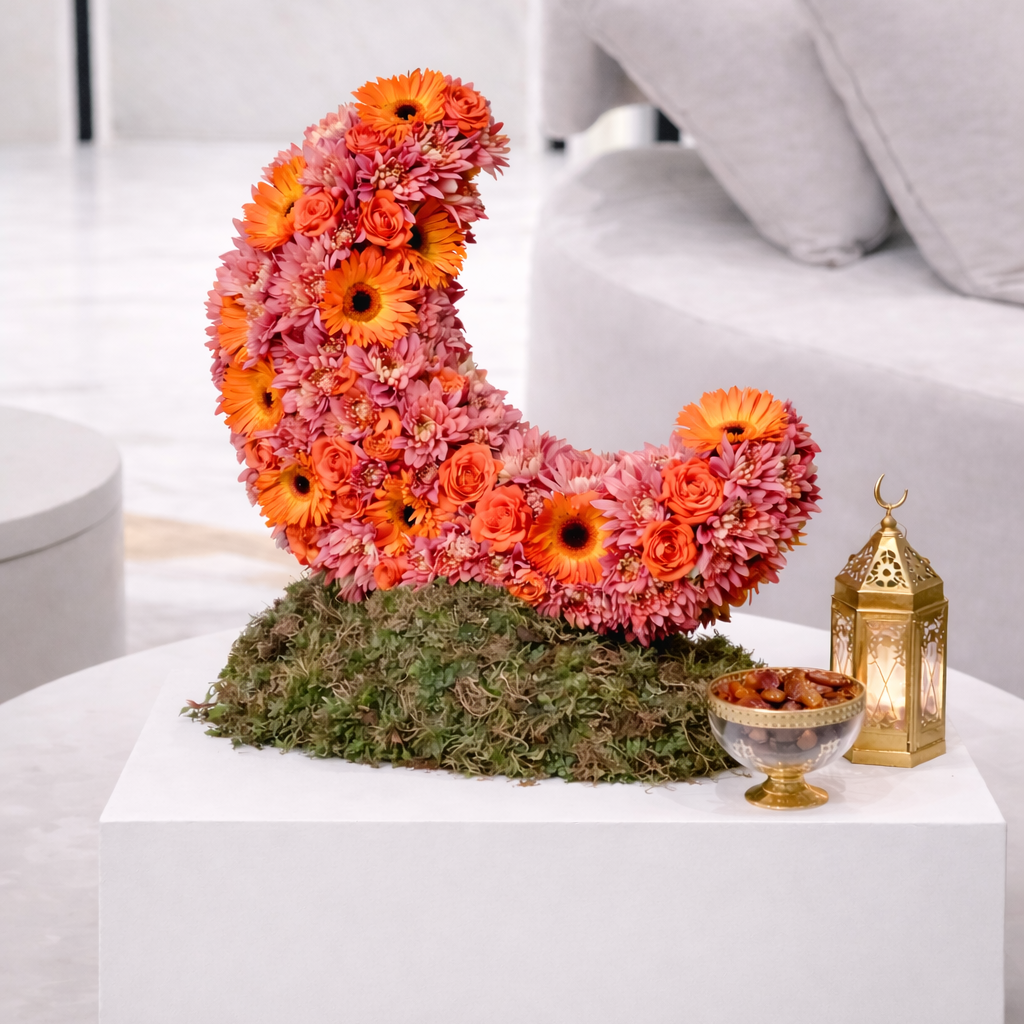 Crescent Amber is a vibrant floral sculpture from our exclusive Ramadan Collection, designed and created in-house by Cherry Blossom Dubai. Inspired by the crescent moon, this signature piece brings together warmth, energy, and contemporary floral artistry for the holy month.