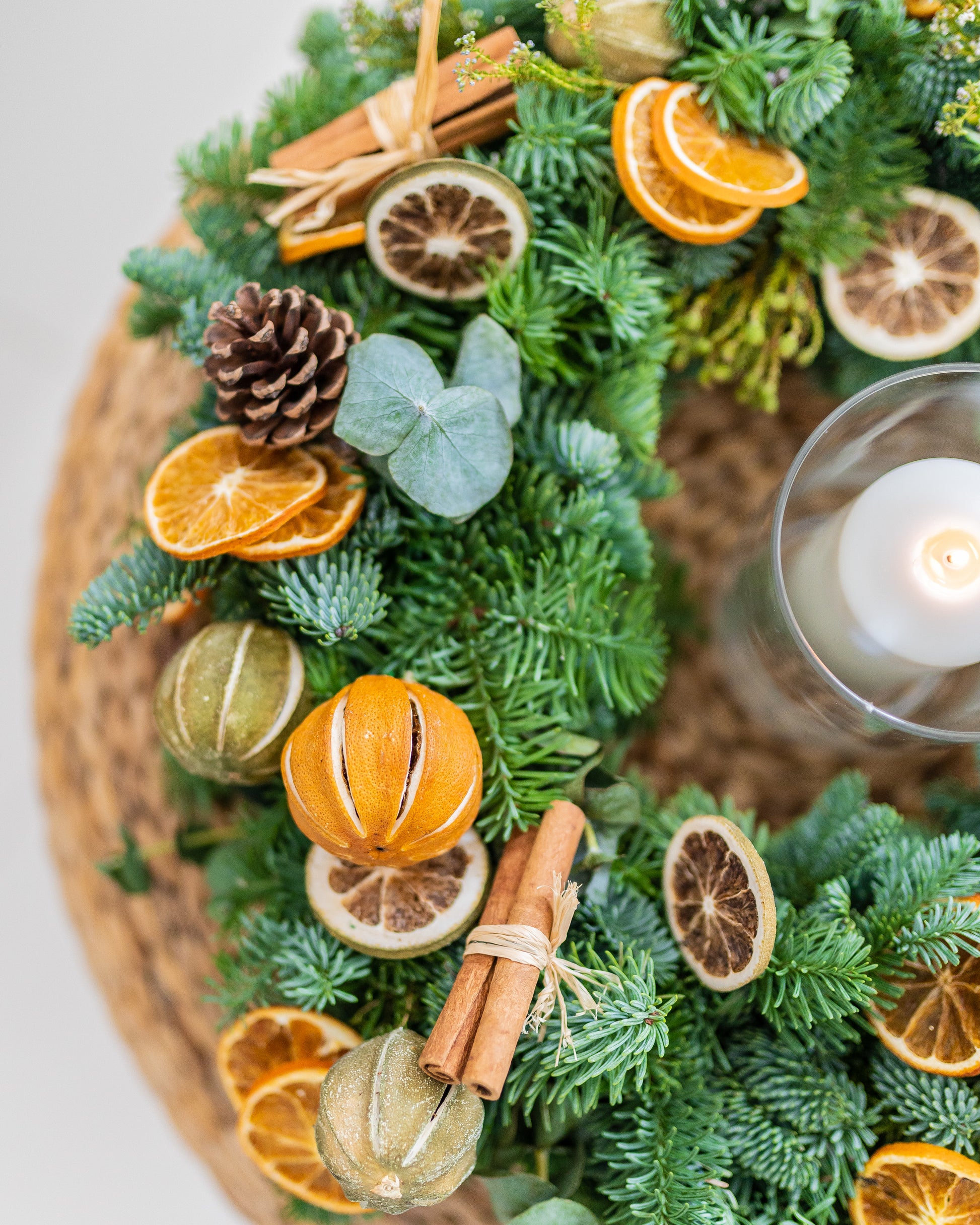 Water only the fresh greenery, such as pine, fir, and flowers (e.g., gypsophila). Keep the arrangement hydrated to preserve freshness. Use a fine mist spray bottle or gently water the base. Avoid watering any dried elements, such as fruits (lemons, oranges), cinnamon sticks, or baubles, as moisture can cause damage or mold growth.
