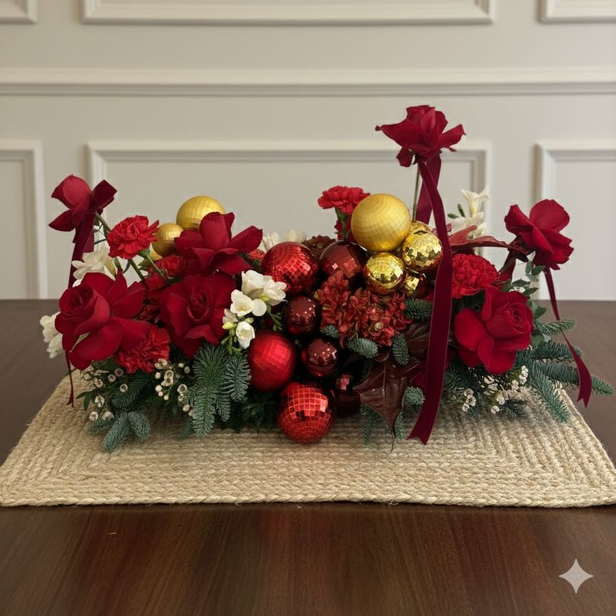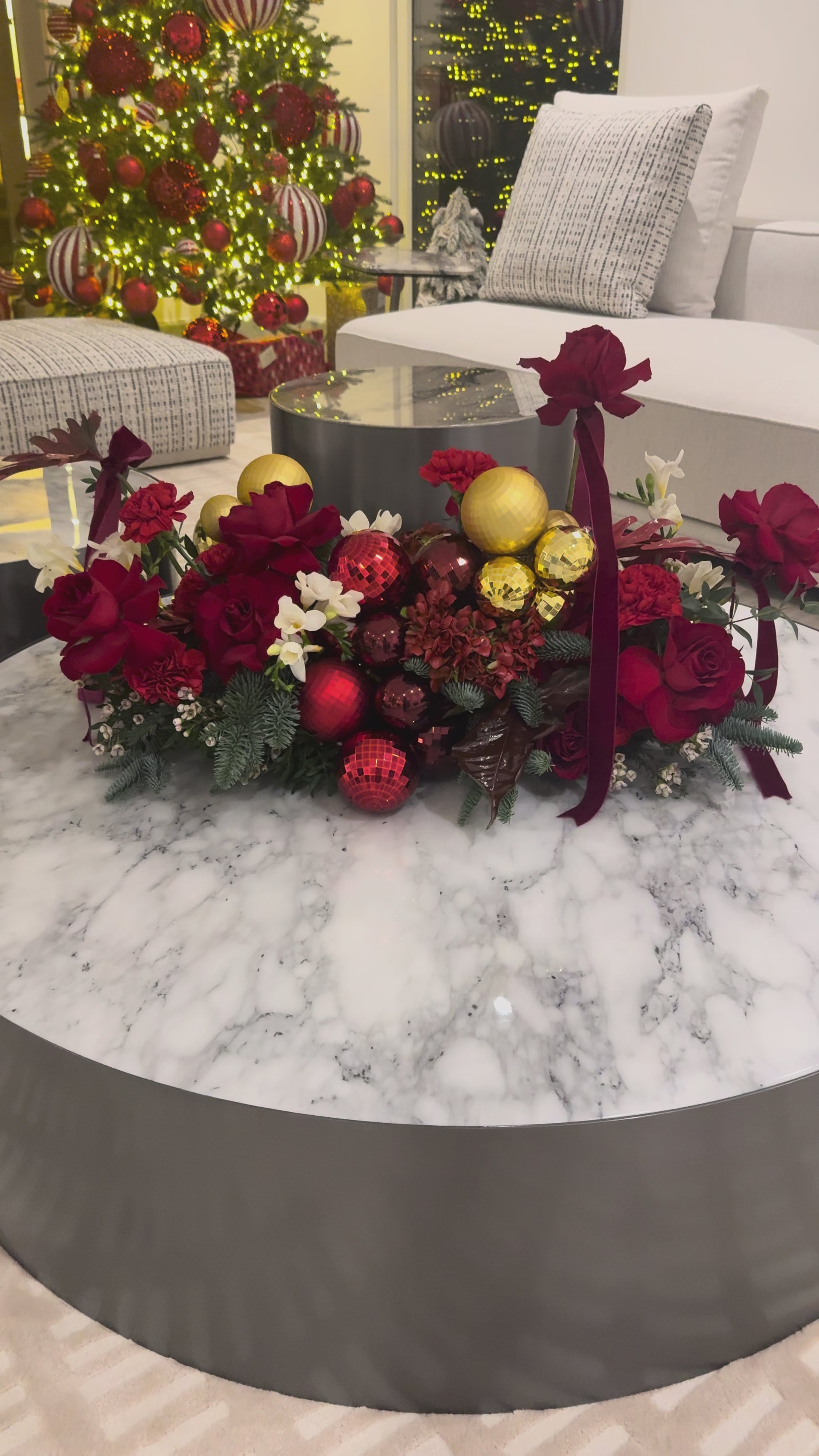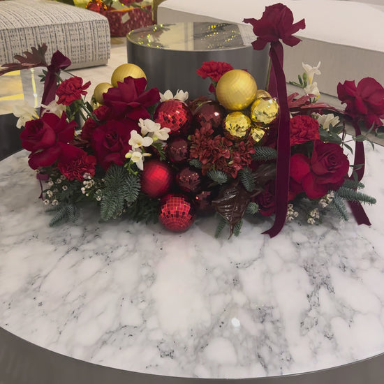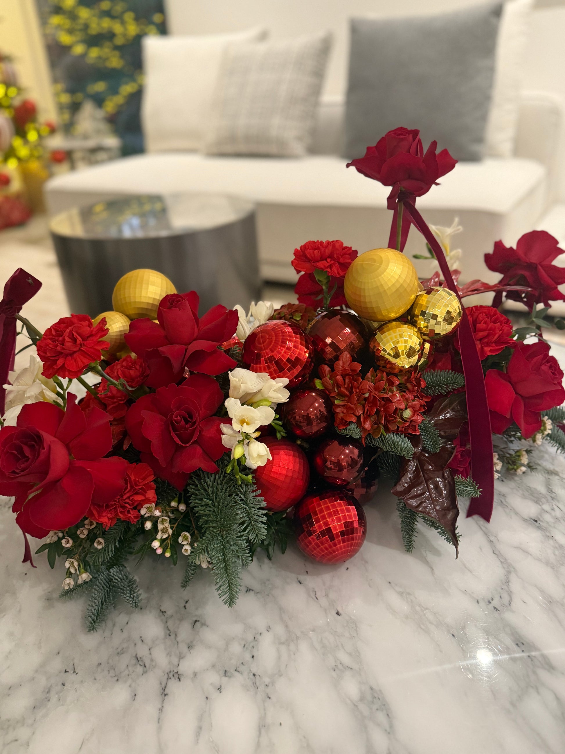 Imperial No. 25 is a grand festive centerpiece designed in rich red and gold tones, handcrafted with premium roses, hydrangeas, wax flowers, and a striking cluster of glossy Christmas baubles. This luxury holiday arrangement brings depth, warmth, and opulence to any setting, making it the perfect Christmas table décor for hosting, gifting, or elevating your home this season.