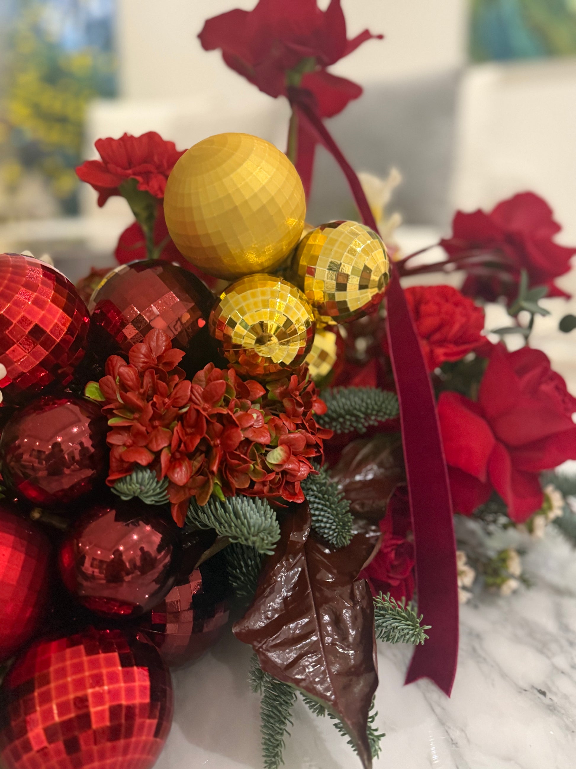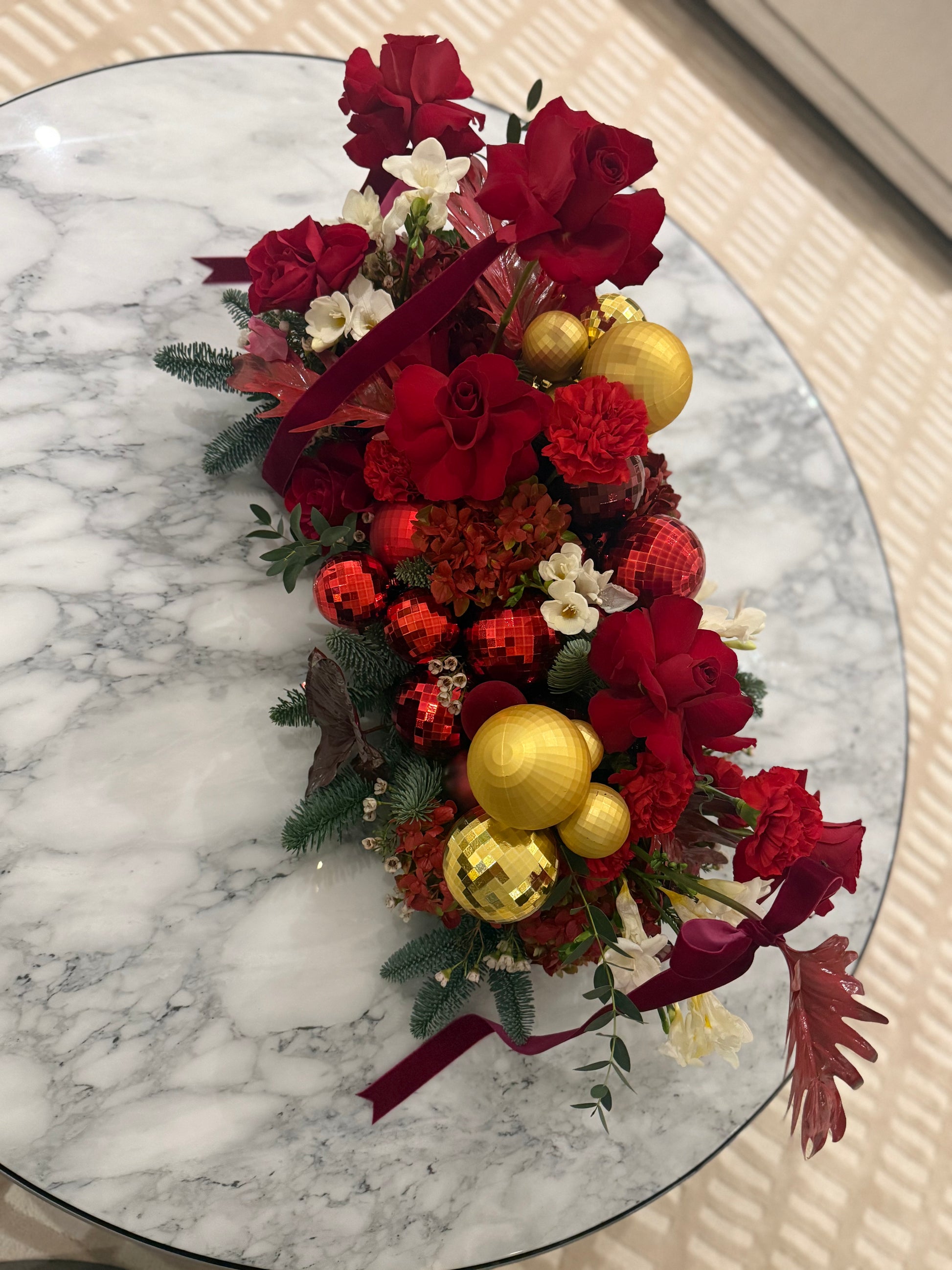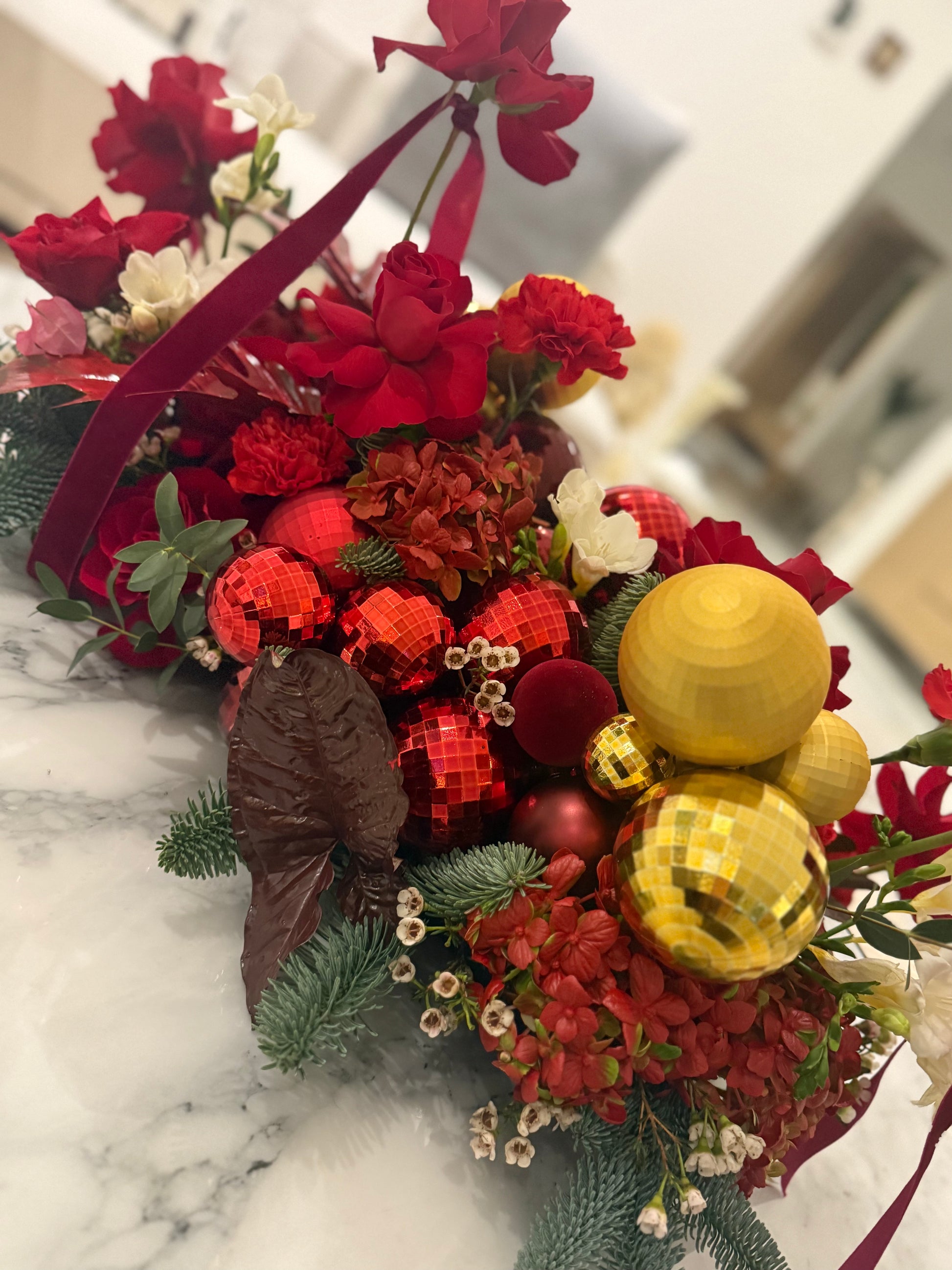Imperial No. 25 is a grand festive centerpiece designed in rich red and gold tones, handcrafted with premium roses, hydrangeas, wax flowers, and a striking cluster of glossy Christmas baubles. This luxury holiday arrangement brings depth, warmth, and opulence to any setting, making it the perfect Christmas table décor for hosting, gifting, or elevating your home this season.