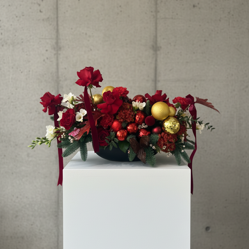 A grand festive arrangement presented in our signature hat box, designed with dense clusters of gold and deep red baubles for a bold, high-impact finish. Rich in scale and detail, this piece is unapologetically extravagant and created to stand out.