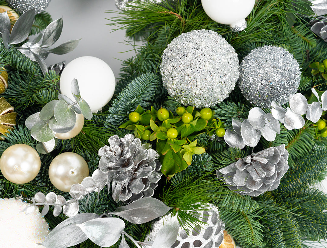 The Metallic Winter Wreath brings a sleek, contemporary twist to festive décor. Crafted with fresh Nobilis pine and styled with silver ornaments, metallic lotus pods, metallic pinecones, whole limes, sliced lemons and soft white accents, it blends cool metallic textures with fresh natural citrus for a modern winter palette.