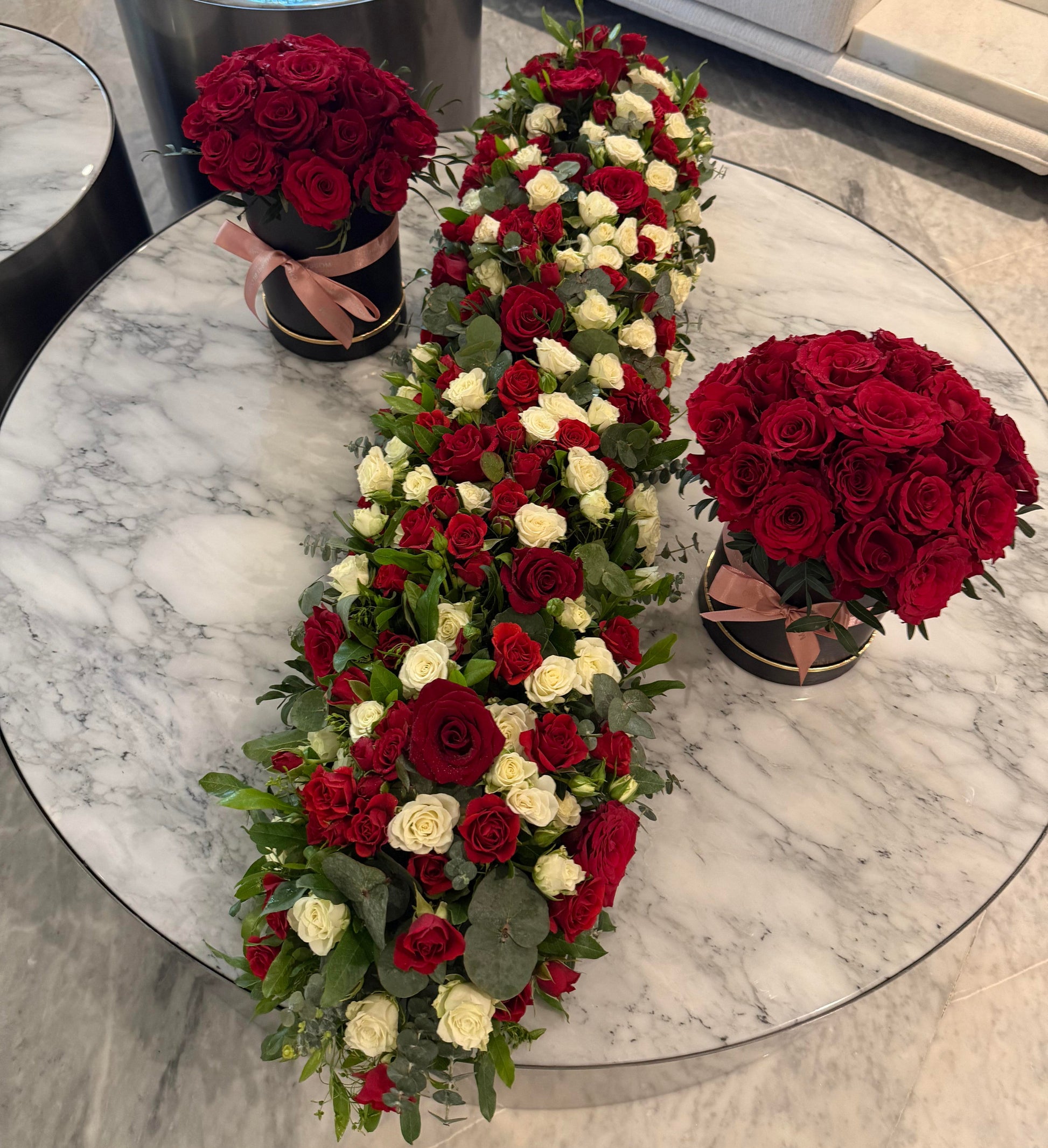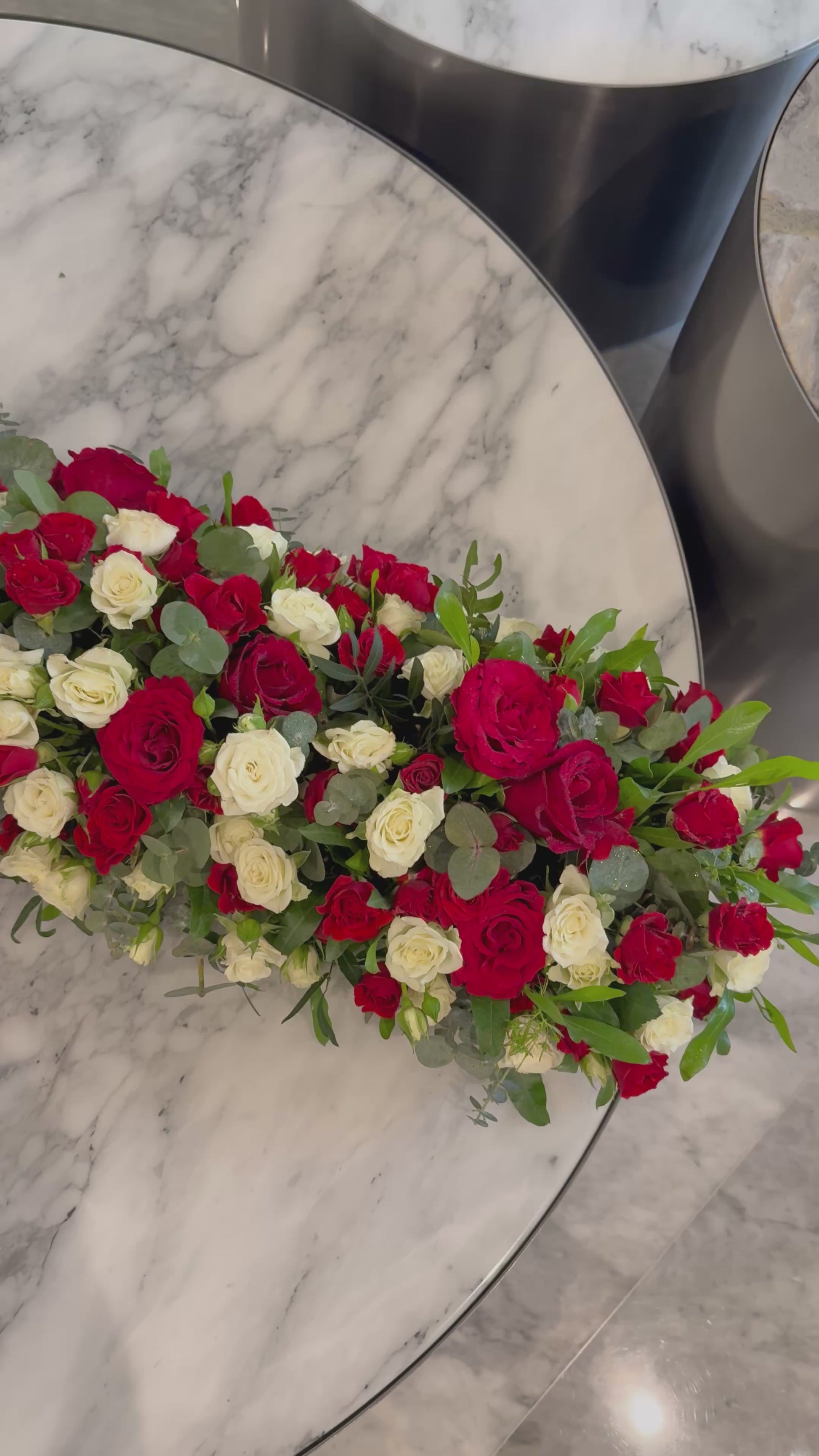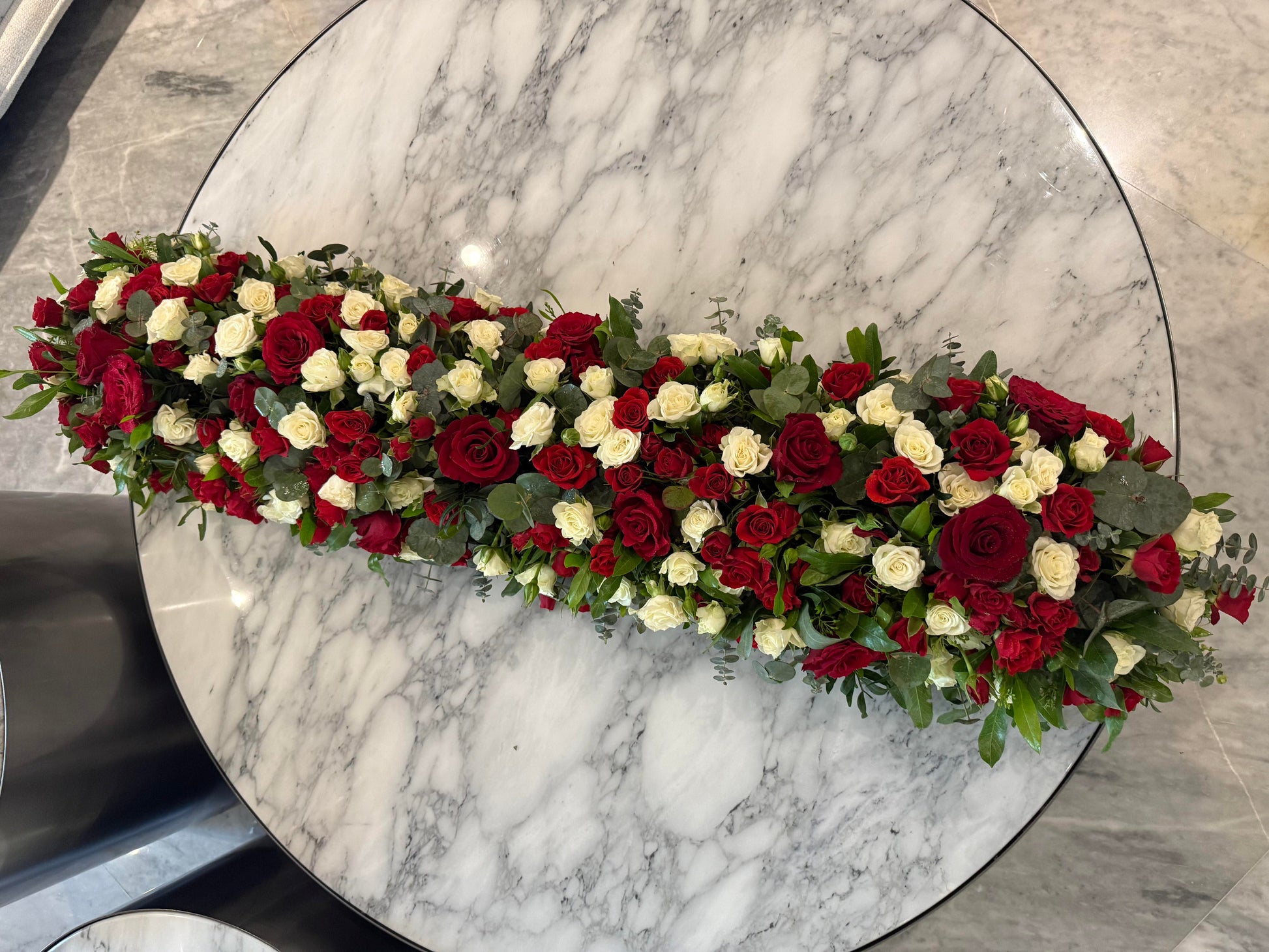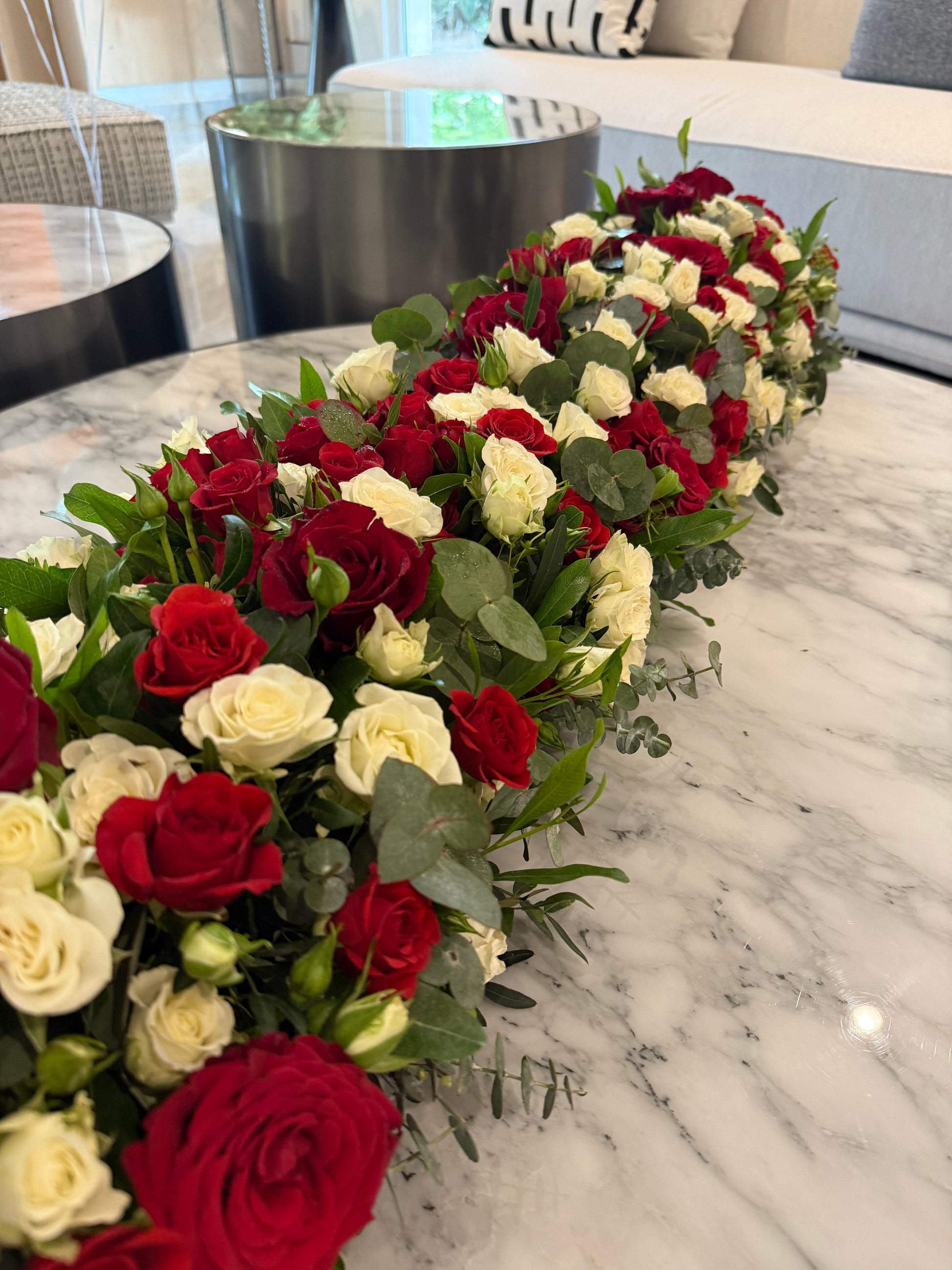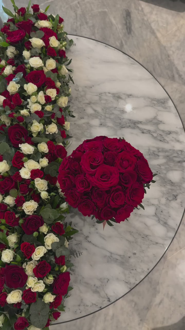 Rose Rhapsody is a show-stopping table arrangement designed to leave a lasting impression. A rich tapestry of velvety red roses and delicate white spray roses is artfully layered over a bed of lush greenery, creating a bold yet balanced display. The vibrant blooms seem to flow effortlessly, while the fresh ruscus and eucalyptus leaves spill out naturally, adding depth, movement, and texture. Its elongated shape commands attention, making it the perfect centrepiece for those who appreciate floral styling that blends romance with striking elegance.