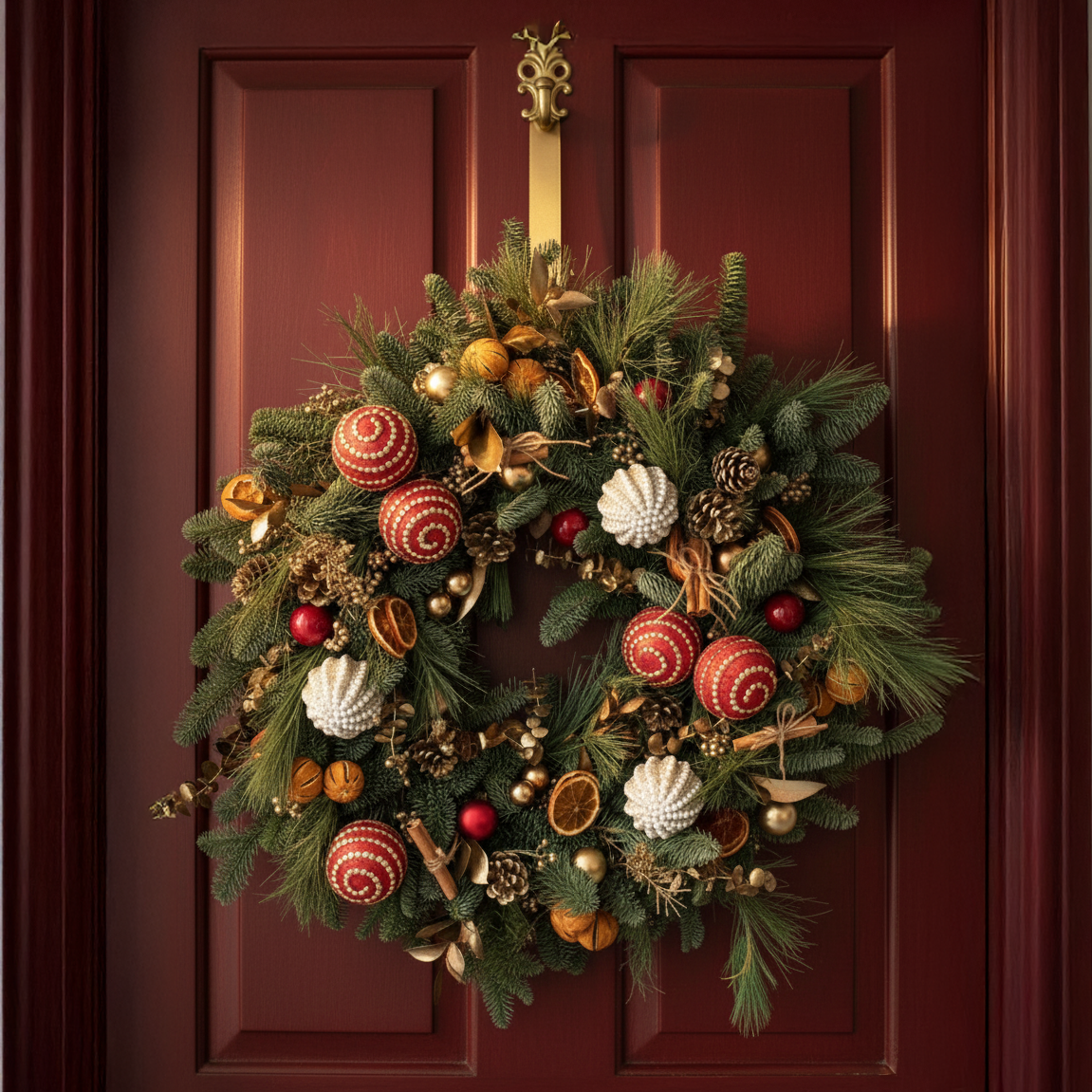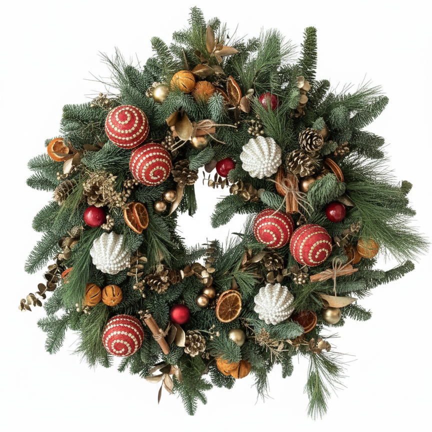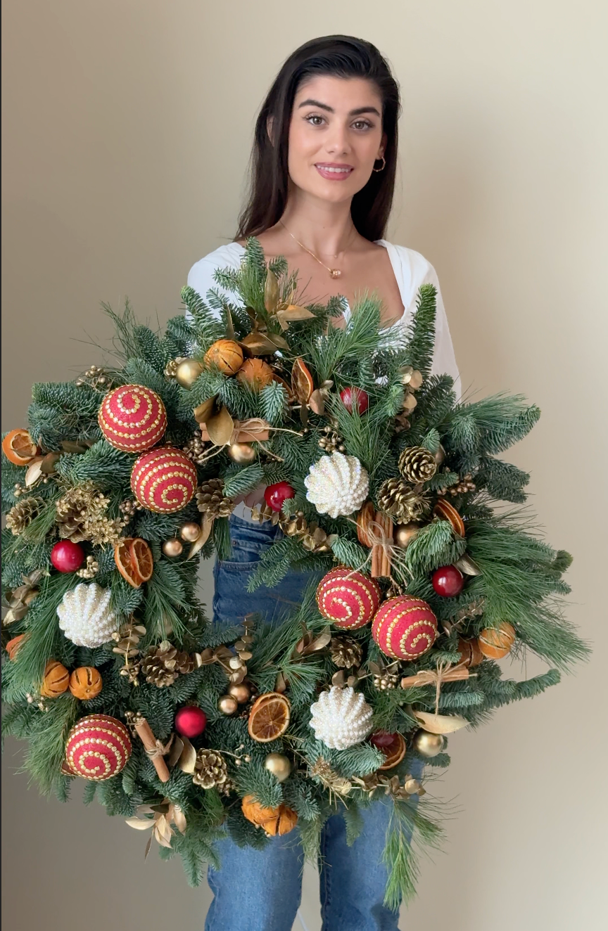 The Rudolph is a playful, joyful Christmas wreath bursting with festive colour, texture, and character. Hand-crafted using fresh premium Nobilis pine, this luxury Christmas wreath features bold red baubles, spiral ornaments, crackled pinecones, cosy cinnamon sticks, shimmering gold accents, and dehydrated orange slices for warmth and fragrance. Full, vibrant, and designed to stand out, it brings instant cheer to any front door, entryway, console, or mantel.