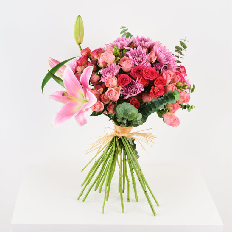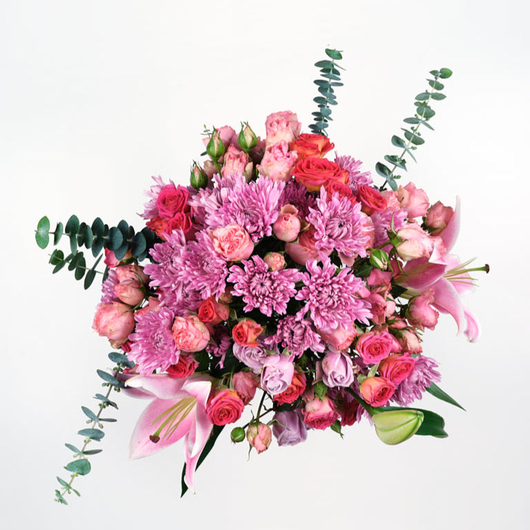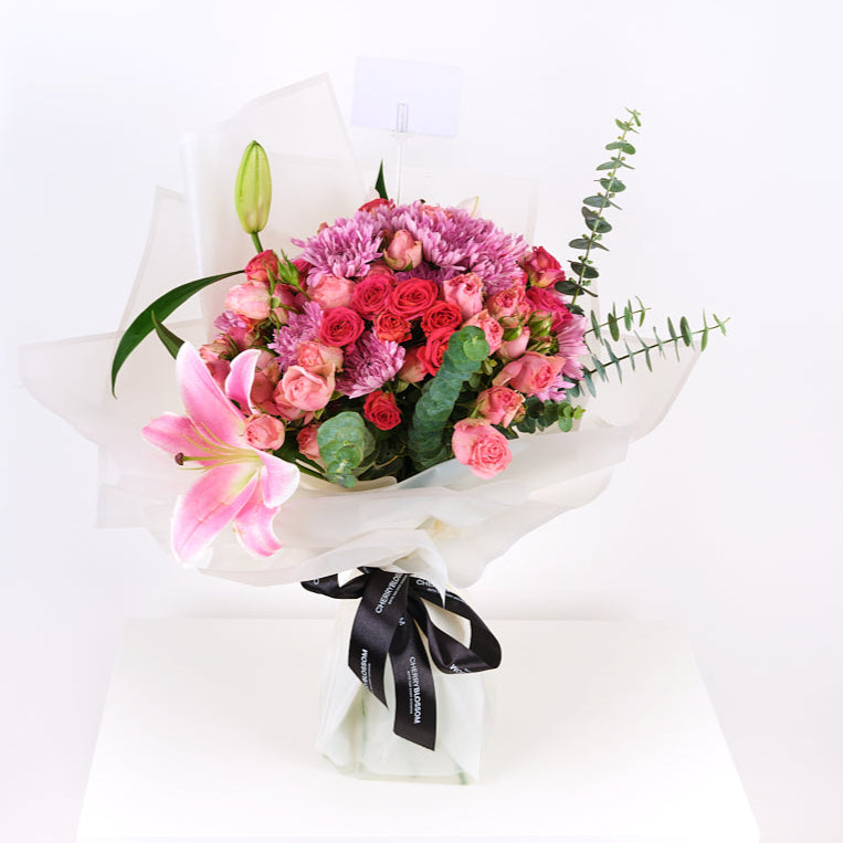 Treasure is a bouquet that celebrates understated beauty. Featuring charming spray roses as the centrepiece, this arrangement is complemented by the soft elegance of lilies and the cheerful touch of chrysanthemums. The addition of eucalyptus provides a natural, aromatic finish, creating a bouquet that’s both refreshing and timeless.