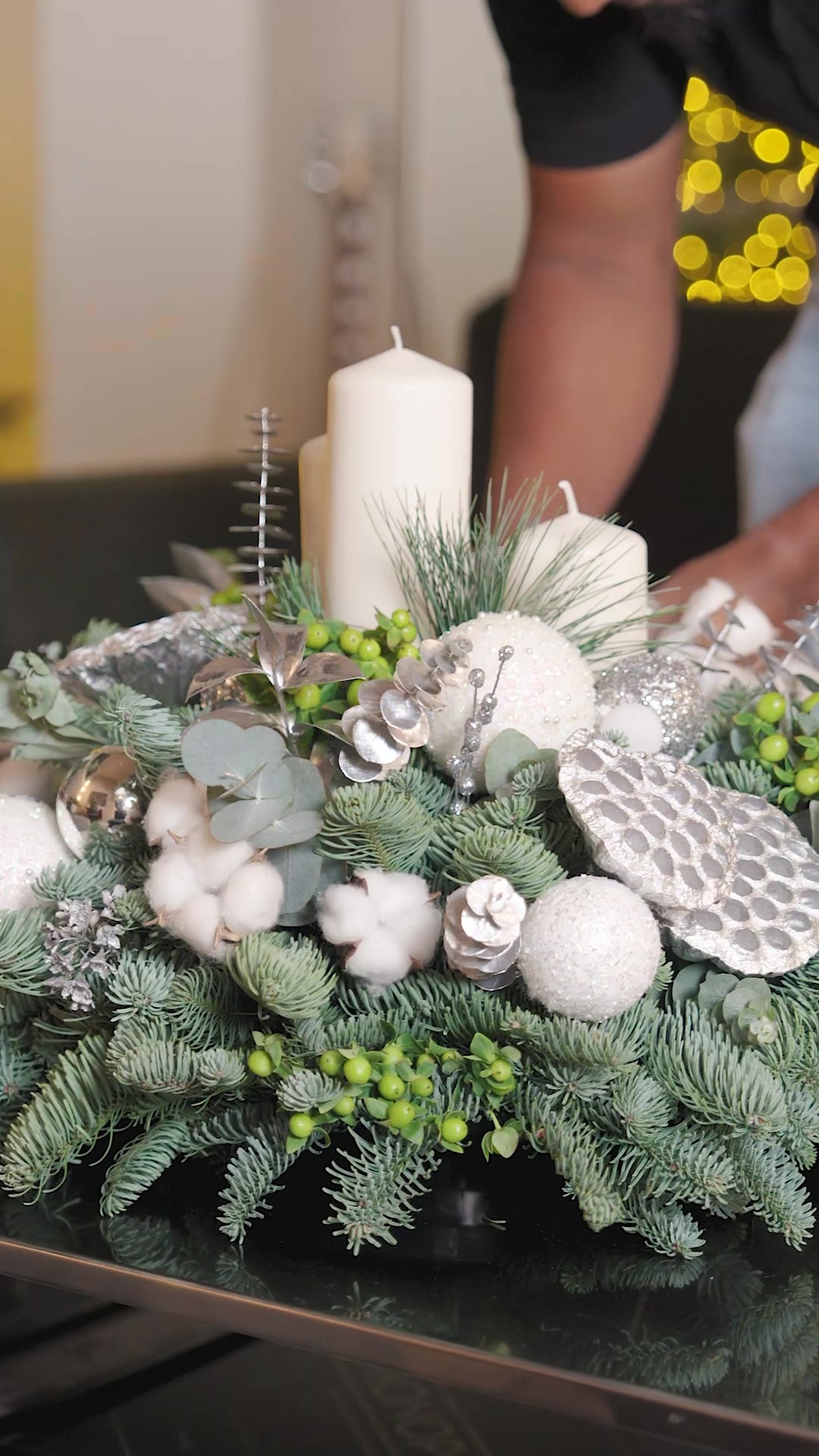 The Winter Metallic Centerpiece with 4 Candles adds a soft, modern glow to festive settings. Crafted with fresh Nobilis pine and eucalyptus, it features cotton, textured baubles, silver ornaments, metallic lotus pods, silver foliage, and vibrant green berry accents, all styled around four pillar candles that create a warm, serene focal point.