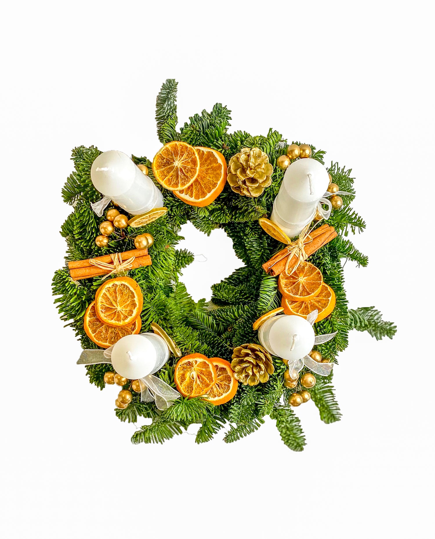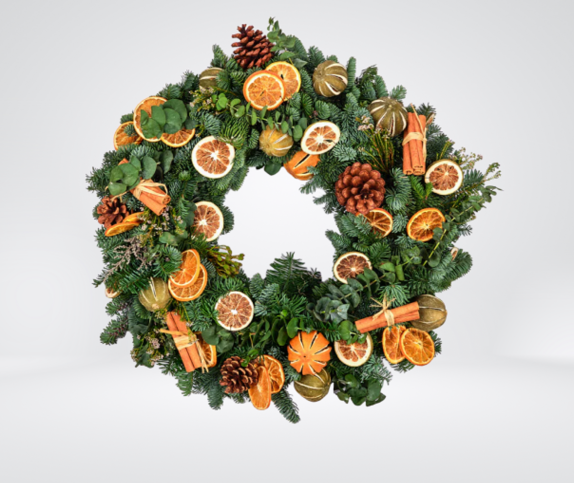 "The Traditional" is a Christmas classic, evoking feelings of nostalgia. Made with fresh nobilis pine, whole green oranges, whole orange oranges, rustic pine cones, dehydrated orange slices in green and orange, aromatic baby blue eucalyptus, and then finished off beautifully with our hand-tied cinnamon sticks. A wreath that will fill your hearts and homes with it's lovely aroma and gorgeous colours.