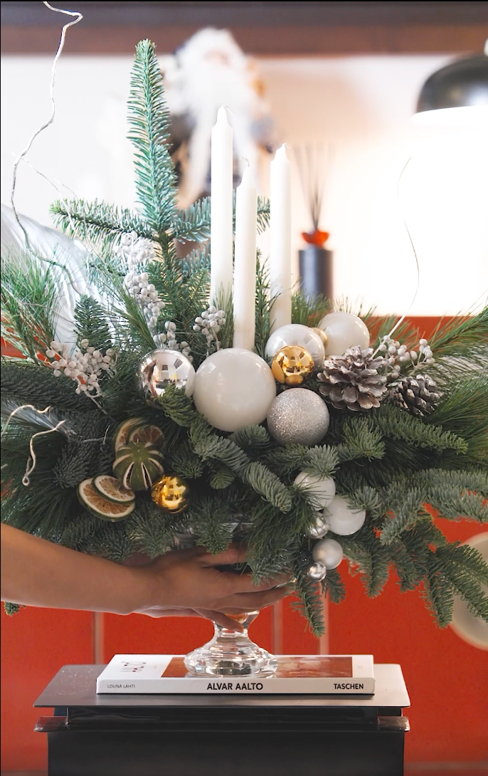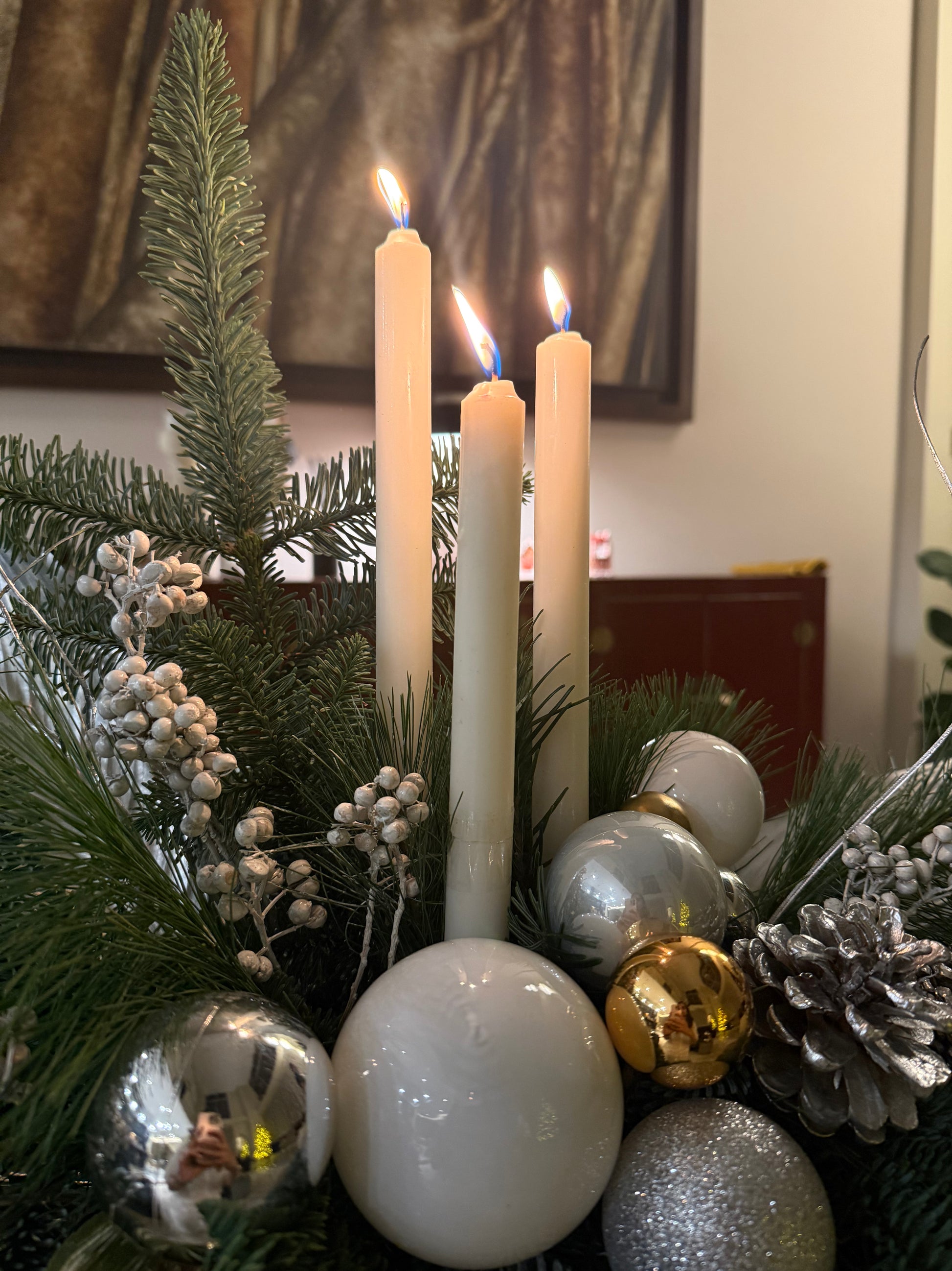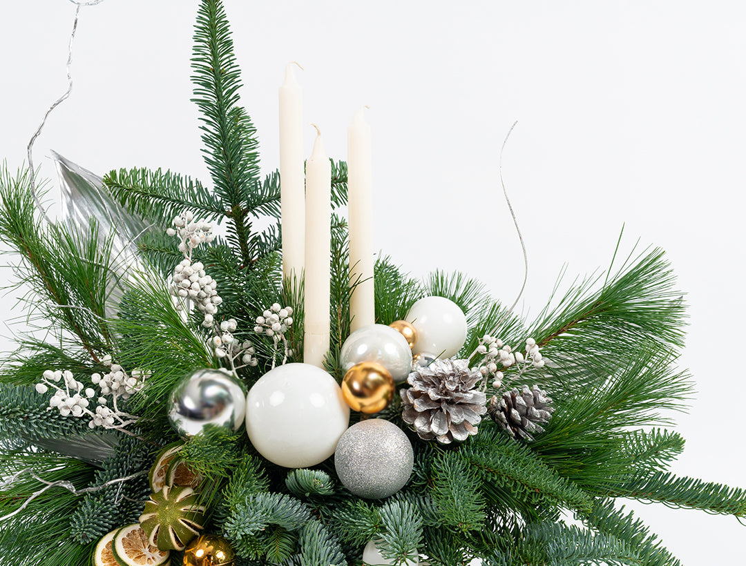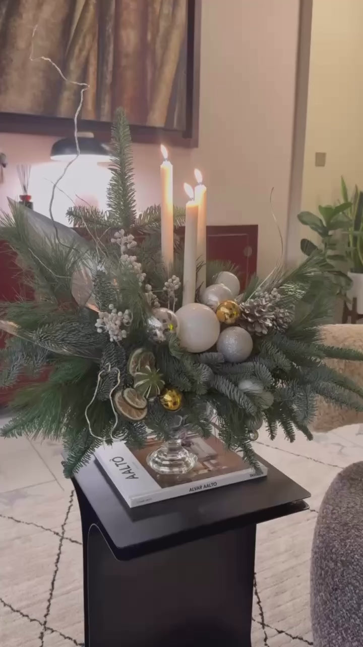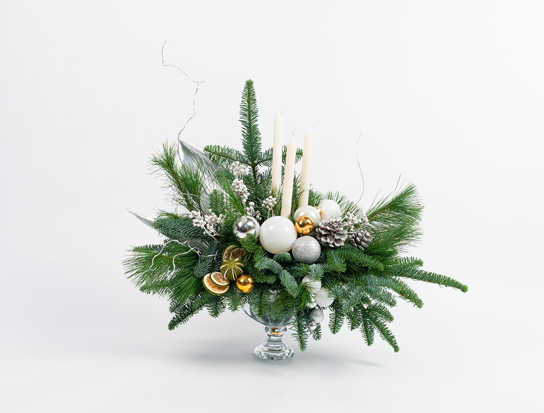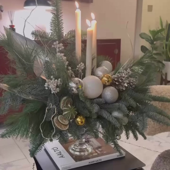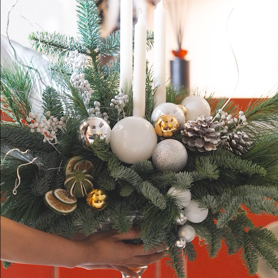 Lumière Royale is a striking celebration of candlelit festive luxury, designed as a true statement of the season. Crafted with fresh, full Nobilis pine and layered with sculptural silver foliage, pinecones, dried citrus accents, and a refined mix of silver, ivory and champagne baubles, this arrangement is anchored by elegant tapered candles that rise beautifully from the centre.