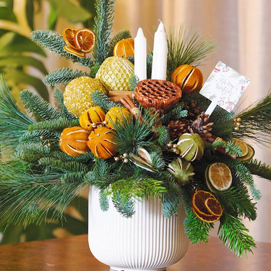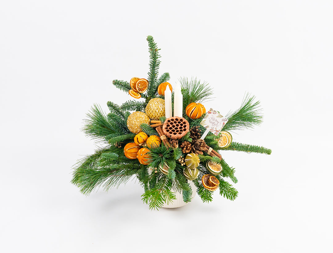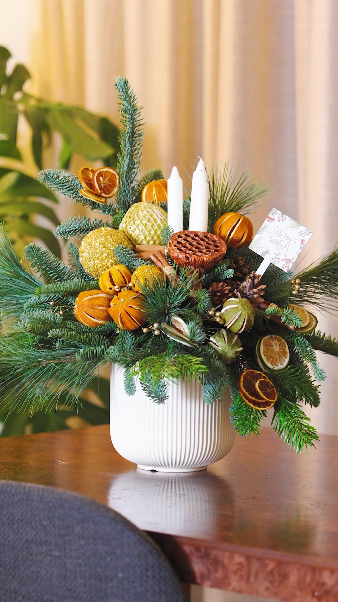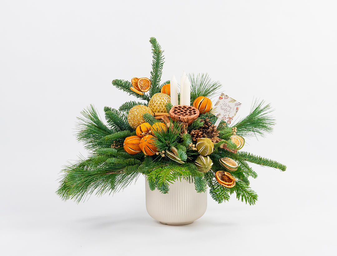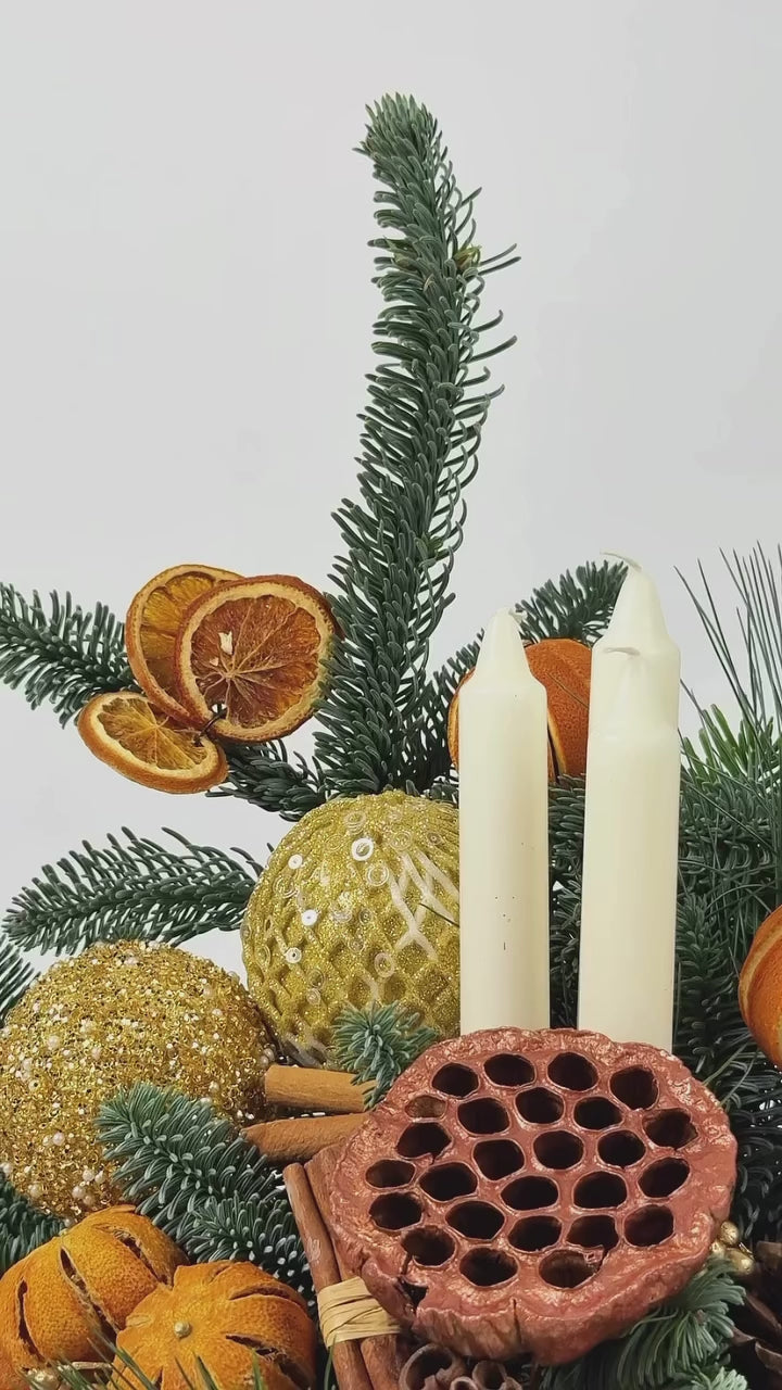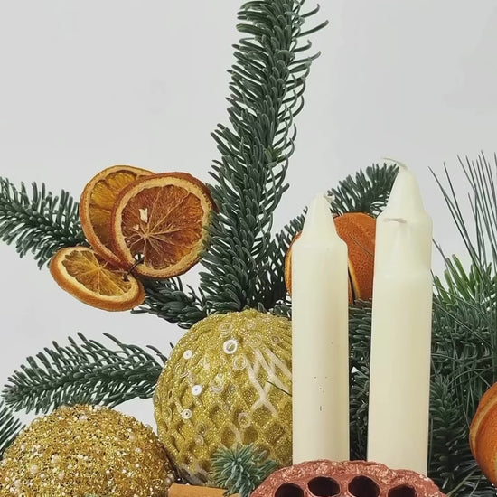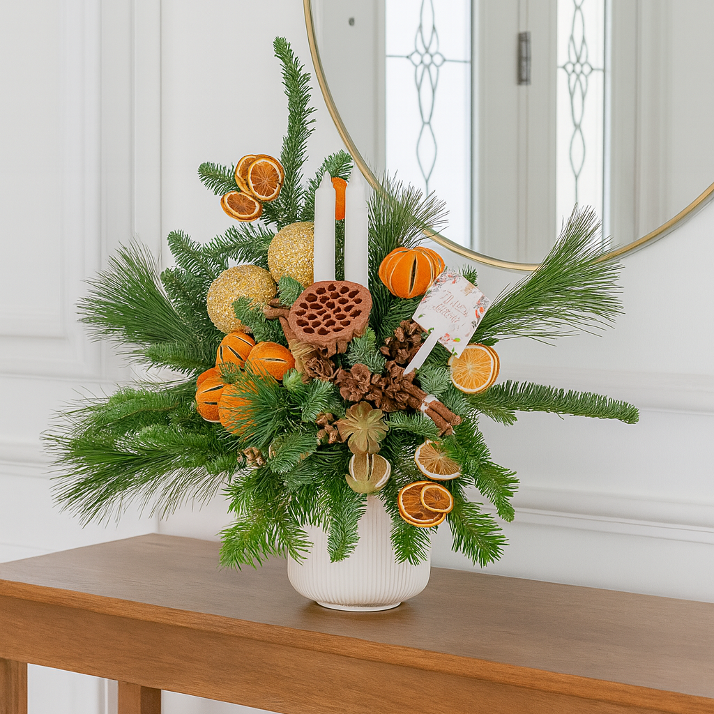 The Nordic is a striking festive arrangement inspired by the clean, cosy beauty of Scandinavian winter décor. Designed with lush Nobilis pine, long-needle winter greenery, dried whole oranges, dried orange slices, cinnamon sticks, pinecones, lotus pods and golden holiday accents, it brings together rich textures and warm seasonal fragrances. Three elegant taper candles sit at the centre, creating a soft, glowing ambience that instantly elevates any Christmas setting.
