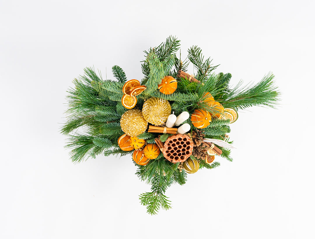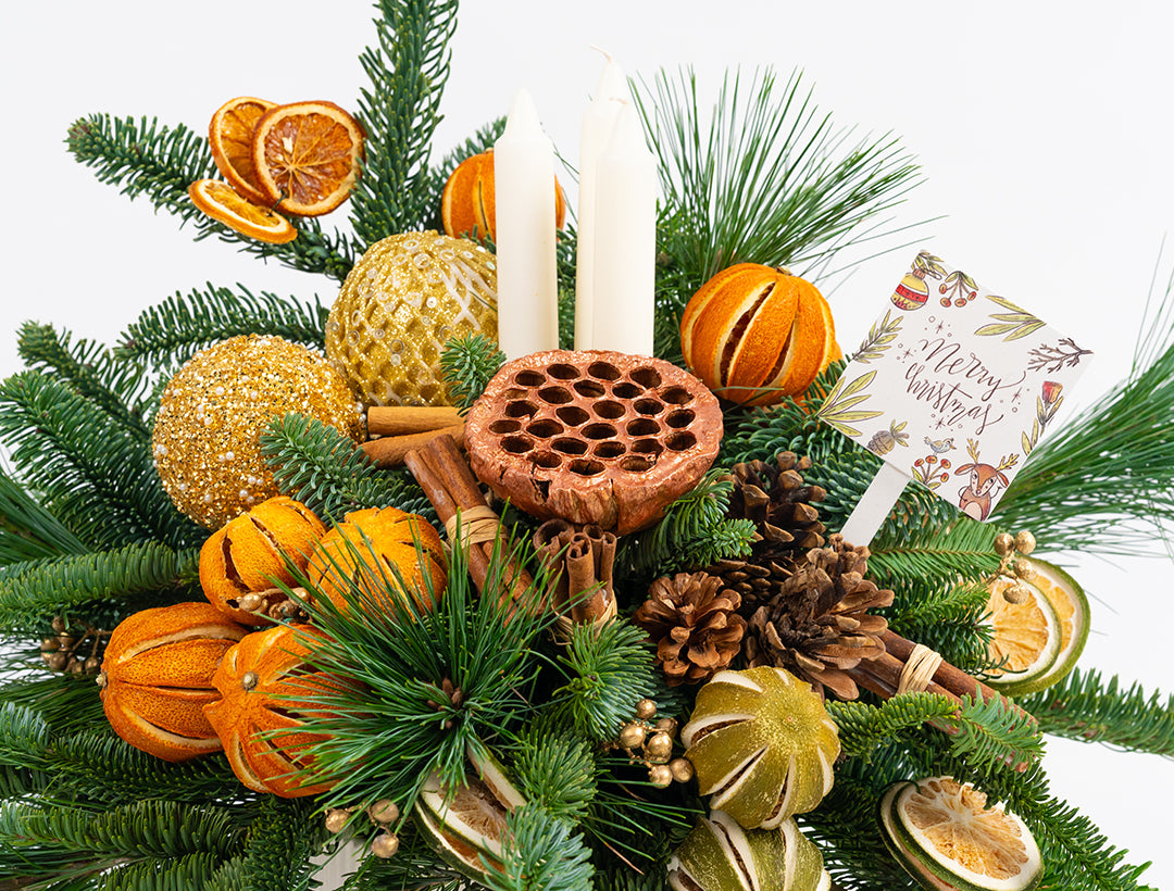 Water only the fresh greenery, such as pine, fir, and flowers (e.g., gypsophila). Keep the arrangement hydrated to preserve freshness. Use a fine mist spray bottle or gently water the base. Avoid watering any dried elements, such as fruits (lemons, oranges), cinnamon sticks, or baubles, as moisture can cause damage or mold growth.